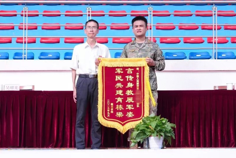 江爱民向承训单位赠送锦旗,并宣读《关于表彰2025级学生军训先进集体及先进个人的决定》。与会领导为获奖代表颁奖。